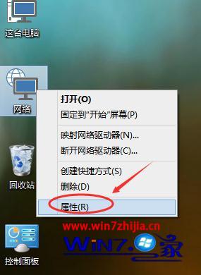 1、右键win10系统桌面上的网络,再打开跳出菜单上的属性,如下图所示;