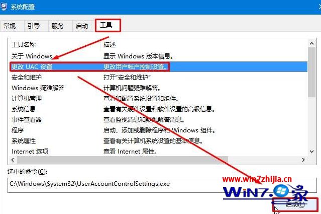 2、切换到【工具】选项卡,在下面选中【更改UAC设置】,打开【启动】;