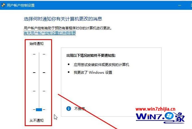 3、将【网友账户控制设置】下面的滑块移动到最底部“从不通知”,打开【确定】,在跳出的框中打开“是”便可,然后在系统配置框中打开确定。