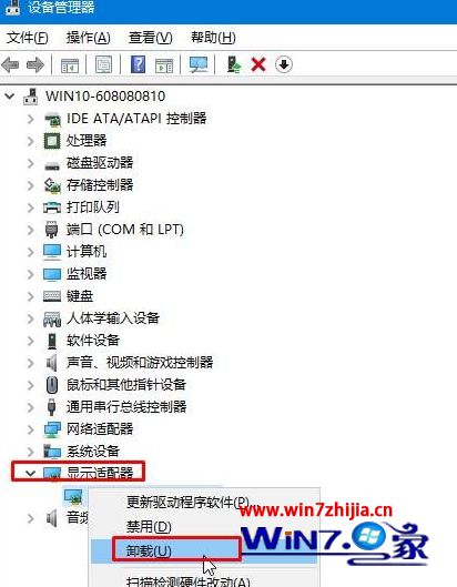 2、展开“显示适配器”,将下面的显卡上点击右键,打开“卸载”将驱动卸载;
