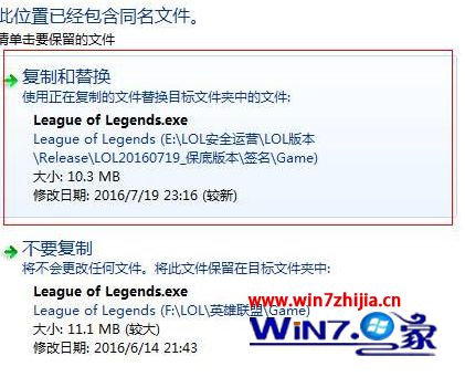 3、 把奔溃补丁解压到/英雄联盟/Game/ 目录下,在跳出的框中选中“复制且替换”;