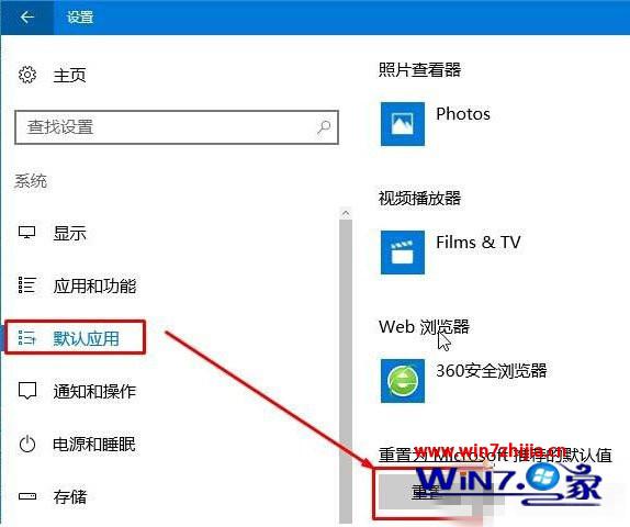 2、在左侧打开【默认应用】,然后在右侧拉到底部,打开【重置为Microsoft 推荐的默认值】下面的【重置】按钮;