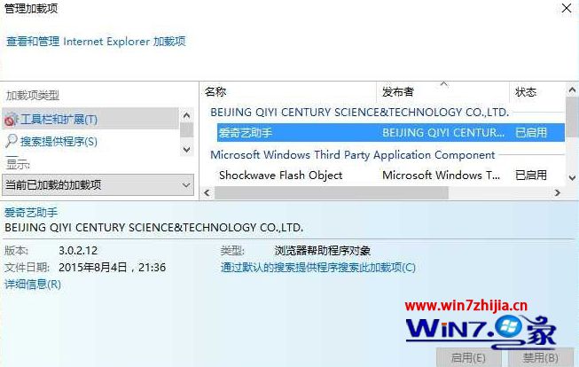 4、通过上面的设置以后,iE中的“管理加载项”中已经无法对加载项进行禁止或启用。