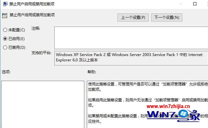 3、双击对“禁止网友启用或禁止加载项”,配置为启用便可;