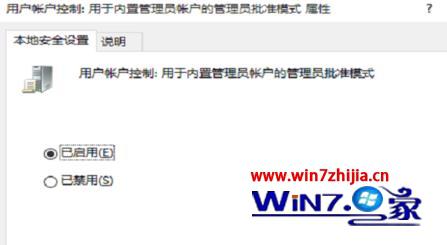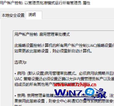 11、双击进入<以管理员批准模式运行所有管理员>配置,将最上方的TAB栏移至说明项,如下图所示,可以看到选项的默认值是哪个,如这个配置的默认为启用,这样即便记不清原始配置也可以按此调整。