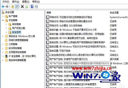 5、下拉右方的滚动箭头,直至出现网友账户控制选项出现,主要是两行的配置,<以管理员批准模式运行所有管理员>,<用于内置管理员账户的管理员批准模式>,参考下图。