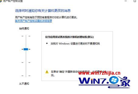 9、出现选中<何时通知你有关计入算机更改的消息>的配置界面,由上至下分别为始终通知--从不通知四个选项,上下拉动滑动块进行配置,用从上至下的第二档默认配置就好。