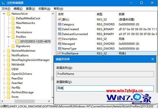 2、在打开的注册变编辑器窗口中,依次展开 HKEY_LoCAL_MACHinE\soFTwARE\Microsoft\windowsnT\CurrentVersion\networkList\profiles\, 在该项下你会看到一个或多个子项,每一项就代表一个网络,选中其中一项后,在右侧会出现一系列注册表键值,其中的profilename即代表网络名称,将其修改为你希望看到的名字便可,如下图所示: