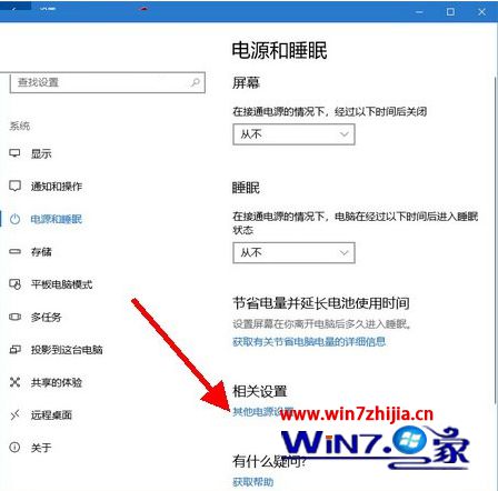 第二步、在系统窗口,打开切换到“电源和睡眠”选项卡,然后在右侧窗口找到并打开“其他电源设置”;