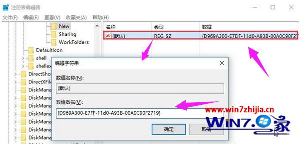 4、在new对应的右侧窗口,(默认)的值是:{d969A300-E7FF-11d0-A93B-00A0C90F2719},如果不是,则左键双击:(默认),在跳出的编辑字符串的对话框中,把数值数据更改为:{d969A300-E7FF-11d0-A93B-00A0C90F2719},再打开确定;