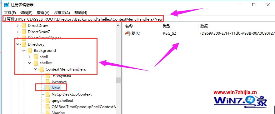 2、在打开的注册表编辑器窗口,展开HKEY_CLAssEs_RooT,在HKEY_CLAssEs_RooT展开项中找到:directory,再依次展开directory\Background\shellex\ContextMenuHandlers;