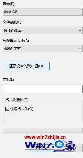 1、首先,在对U盘执行格式化操作时,在跳出的格式化可移动磁盘窗口中,在打开还原设备的默认值按钮,在打开开始按钮尝试格式化U盘;