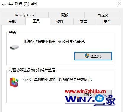 3、在右击可移动磁盘,从跳出的菜单中选中属性,并在打开的窗口中,在切换至工具选项卡,在打开查错开始检查按钮;