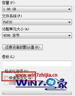 2、然后,在选中一级格式化U盘。在打开的格式化可移动磁盘窗口中,取消勾选快速格式化项,打开开始按钮尝试格式化U盘;
