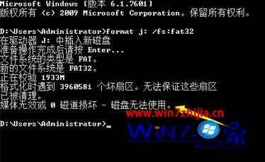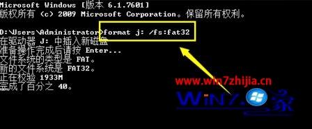 2、然后,在命令提示符中写入format j: /fs:fat32(其中j代表U盘所在盘符)并按回车键执行U盘格式化操作;