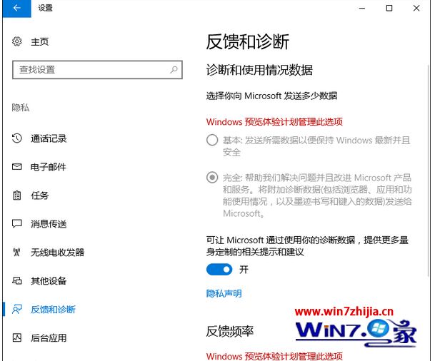 1、其实在win10“设置”的“隐私 - 反馈和诊断”设置界面,咱们也可以实现如上的设置;