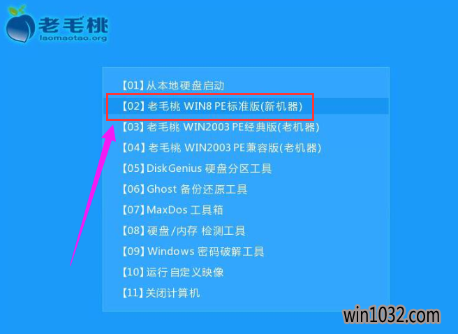 接着移动光标选择“【02】老毛桃WIN8 PE标准版(新机器)”,按回车键确认