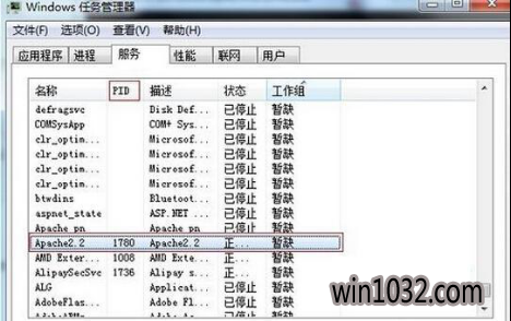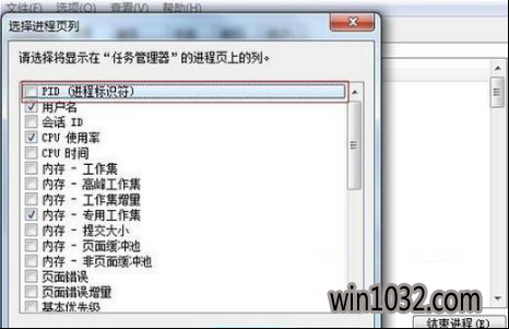4、切换到进程标签页,点击查看选择“列”,然后在“PID”前面打上勾,点击确定,在进程中找到刚才占用80端口的PID,将它关闭就OK了。