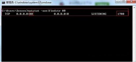 2、在弹出的命令提示符光标处输入“netstat -ano|findstr 80”命令按回车查看80端口,主要是看一下那个PID,以便在进程中可快速查找到占用80端口的程序,如图示这里PID是1780