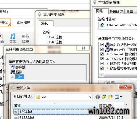 3、在选择网络功能类型中,选择协议,然后从磁盘安装,选择c:\windows\inf 找到1394.inf;