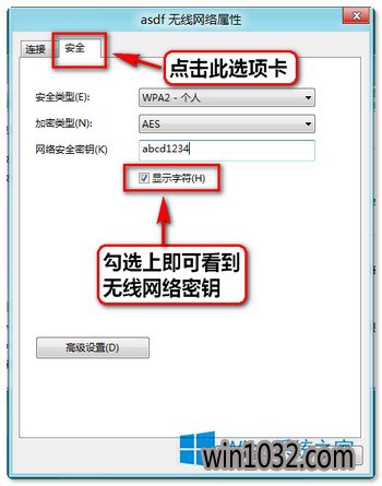 4、点击“安全”选项卡,勾选上“显示字符”便可查看到没有线密钥。